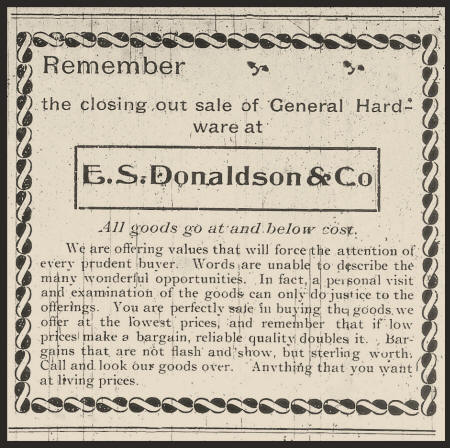 Ezra S. Donaldson was a Minnesota born hardware merchant merchant in Greenwood, Wisconsin. He was a tall man of medium build with blue eyes and brown hair. He was born November 24, 1875 and married his wife, Josephine M. in 1899. She was also a Minnesota native and was born in April of 1876. February 12, 1900, Ezra and Josephine were faced with the unexpected death of their tiny baby which they buried with great sadness in the Greenwood City Cemetery. In August, Josephine had a prolonged visit with her family in Minnesota.