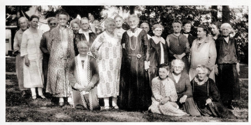 Left to Right: Mrs. E. T. (Isabelle) Burch, Mrs. H. H. Hartson, Mrs. Ketchpaw, Mrs. J. Volk, Mrs. Haglund, Mrs. Pfunder Sr., Miss Vates over Mrs. Hendren's shoulder, Mrs. Vine, Mrs. C. H. Clute, Mrs. V. J. Carter, Mrs. Rock Masters, C. Huntzicker, Mrs. John Shanks (Auntie). Very front row: Mrs. Wm. Howard, Mrs. John Drummond, Mrs. Mary Warner, Mrs. Wm. T. Hendren, Mrs. H. Stabnow, Mrs. Fry and Mrs. Lose. |