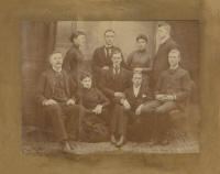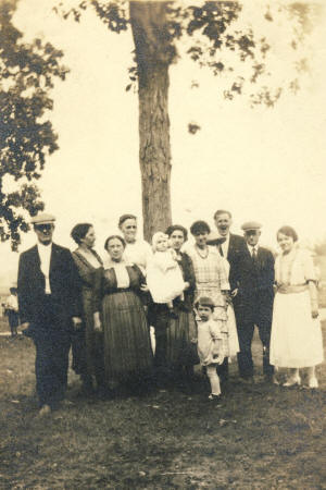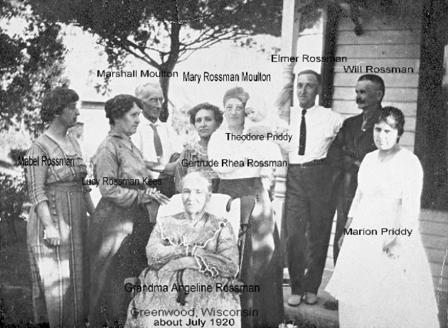 Mary Rossman Moulton is holding Gwendolyn Priddy (born in 1921). Gwendolyn is same Gwendolyn said to be daughter of Ira and Nora Rossman. Gwen was adopted by them. Theodore Priddy standing in front of Mary. He was born Marshall Theodore Priddy in 1920. Mary's daughter Marion is on the end of the right side. Lucy is first woman on the left side. |