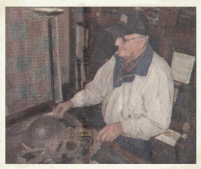 Donald Rogalski of Thorp, WI looked at a WW I helmet and gas mask that belonged to his father, John Rogalski, Sr.