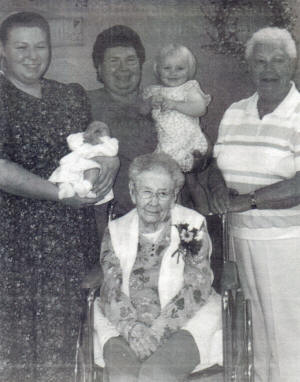 Seated in this five-generation family photo is great-great-grandmother, Clara Hemp. Standing (l-r) are mother Candi Shirk, holding Megan Shirk, born July 28; grandmother Joan Buchholz, holding Abigail Shirk, age 1 ½; and great-grandmother Vivian Bohnsack. (Contributed photo)