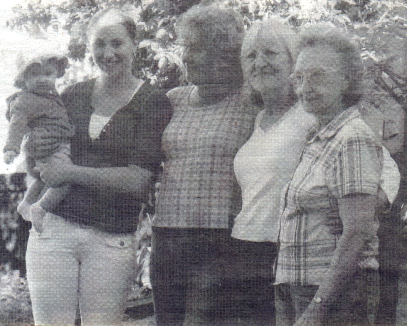 Five generations of the King family got together in Union Grove, Wis. for a photo at the June 4th - 60th Wedding anniversary of former Neillsville residents Ned and Gladys (Kopp) King; They were (from left to right) baby Aaliyah Harris, Mother Ashley Harris, Grandmother Kim Reinhardt, Great-grandmother Shirley Nehls, and Great-great-grandmother, Gladys King.