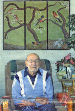 Neillsville resident Frank Hedemark, who turns 100 Nov. 12, poses at his Neillsville home. Above Hedemark is a painting he drew and has displayed at his home. (Photo by Peter Spicer/Clark County Press)