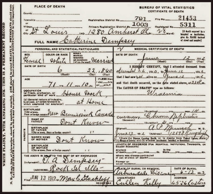 Catherine Dempsey b. 22 June 1837, Canada; d. 12 June 1912, St. Louis, MO