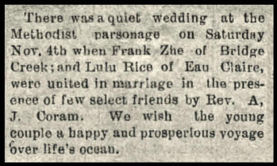 Marriage 1 Arthur W. RICE b: 12 OCT 1849 in Spring Valley,Rock,Wisconsin