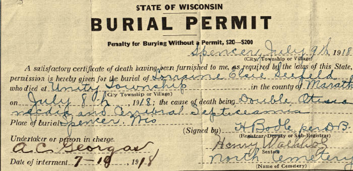 Lorraine Elsie, the one month, four day old infant daughter of Albert and Elsie Seefeld was born 1 Jun, 1918 and died in Unity, Township, Marathon Co., Wisconsin, 8 Jul 1918 of *Double Otitis media and **Cerebral Septicemia. She was the first born of her young parents, 21 yr. old Albert Gottlieb Ernst and 16 yr. old Elsie Emilie (Hendrickson) Seefeld who had married 12 Dec. 1917. It was a sad summer for her parents who buried her tiny body in the St. John Church Cemetery, Spencer, Wisconsin (North Cemetery) long before she had a chance to enjoy the sunshine of life. The undertaker was A. C. Georgas.