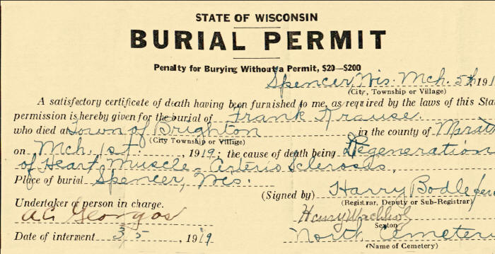 ----Sources: St. John Cemetery, Spencer, Wis. Burial Permit and Church Records provided by Janet Schwarze, tombstone photo by Kathy Englebretson.