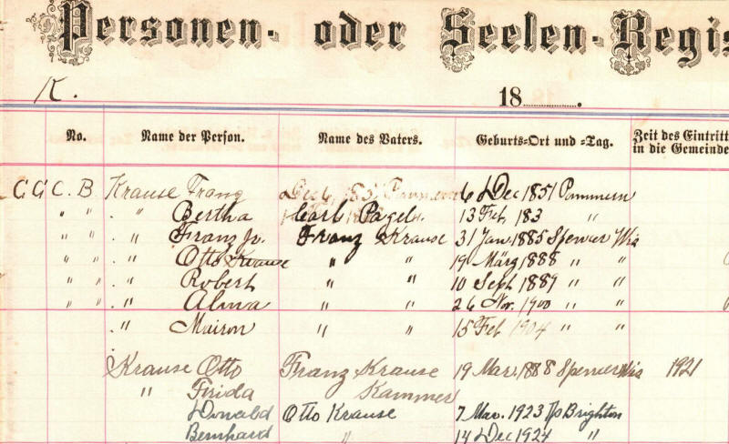 Franz C. Krause was born 6 Dec. 1851, just in time to celebrate his first Christmas in Schontha Provinz, Pommern (Germany). He married Bertha, the daughter of Carl Pagel, 22 May 1887 who was also born in Pommern Germany. Their children were all born in Spencer, Wisconsin:Franz Jr. (31 Jan 1885), Otto (19 Mar 1888), Robert (10 Sep 1889), Alma (26 Mar 1900) and Marion (15 Feb 1904). Bertha became a widow, 1 Mar 1919 and remained so for more than 17 years and when she passed away, 6 Jan 1937, she was laid beside him in St. John's Lutheran Cemetery, North Spencer, Wis.