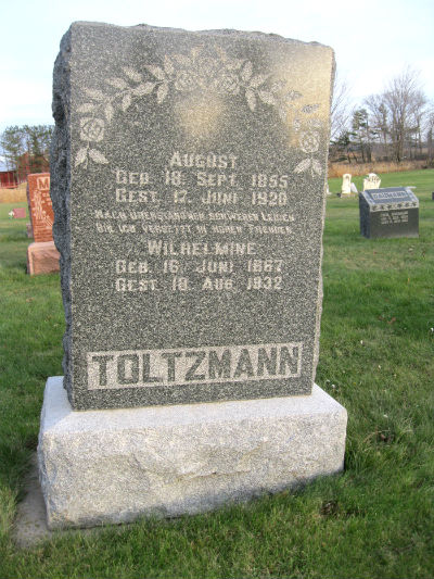 August Toltzmann, a successful farmer, was born 18 Sep 1855 in *Pommern, Germany, the son of Gottlieb Toltzmann and Louise Tank. He married Wilhelmine Manthe (b. 11 Jun 1868, Hustisford, Dodge Co., Wisconsin) Dec. 1884 in Spencer, Marathon County, Wisconsin at St. John's Lutheran Church. She was the daughter of Ferdinand Manthe and Hanna Kelm. August and Wilhelmine's son Albert Gottlieb Carl Toltzmann was born 15 May 1892 in Spencer, Wisconsin. August died 17 Jun 1920 and Wilhelmine passed away 12 years later, 22 Aug 1932, from cancer. Both are buried in St. John's Lutheran Cemetery, North Spencer, Wis.