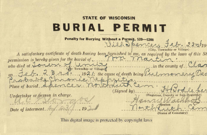 Both William and Bertha Marten are buried in St. John's Lutheran Cemetery, North Spencer, Wis.