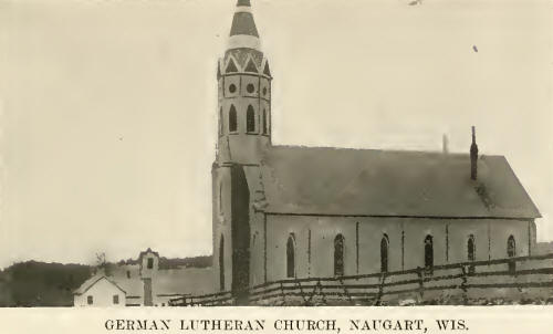 The first minister at Naugart was Rev. J. J. Hoffmann, who was succeeded in 1867 by Rev. William Hudtloff, but soon afterwards the congregation separated and built a church and parsonage, and Reverend Schroedel was called as minister. Under his pastorage the present new church was built and the parsonage. He was succeeded by Rev. W. Bergholz. who remained about eight years and was followed by Rev. John Glaser, who remained with the congregation about nine years, and was succeeded by Rev. H. Brands, who directed the spiritual affairs until the year 1904, when the present minister. Rev. Theo. Hartwig, took charge of the congregation. The ministers serving this congregation also had charge of a congregation having their church edifice on or near the northwest corner of the town, which was established nearlv at the same time as the one at Naugart. The present voting strength of this congregation is 90. with 275 communicants.