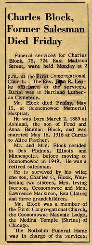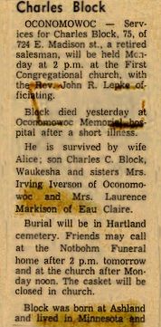 survived by one son, Charles Block of Waukesha, one grandson, Karl Block, two