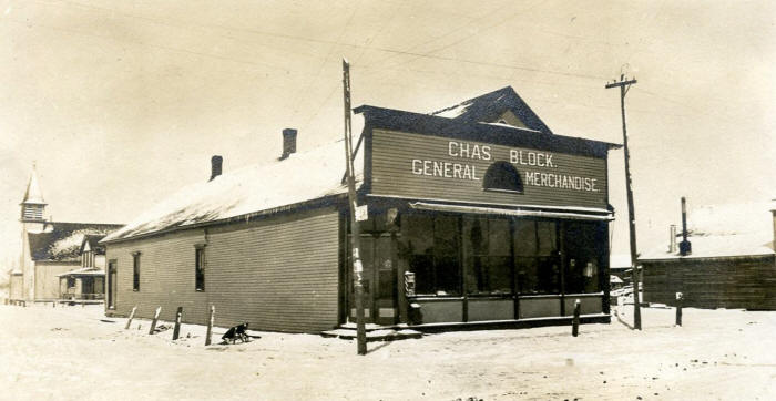 Businesses, L>R: Charles Block's General Merchandise, O & N Lumber Company, Green Bros., barber shop, telephone exchange, restaurant in Green's building, Ecke Meat Market, Curtiss State Graded School, Ben Green residence & St. Paul's Kirche. |