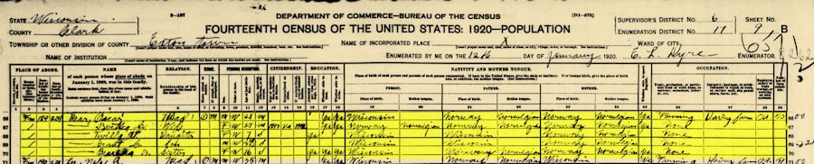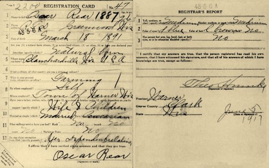 Oscar Rear, Natural born citizen, Male b. 18 Mar 1891 in Blanchardville, WI