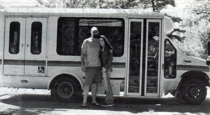 Glenn and Heather Degnitz pose in front of the handicapped-accessible bus parked