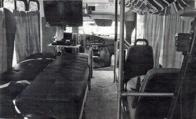 The retrofitted mini-bus has a carpeted floor and includes a futon and a TV with