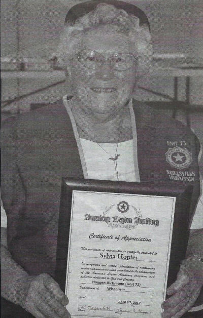 Sylvia Hopfer was honored by the Ladies Auxiliary at the April 3 meeting for her