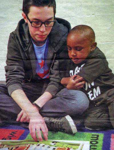 Brady Coulthard reads to an appreciative young student at the Milwaukee MKE