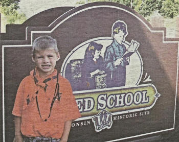 Pack 43 Tiger Scout Brody Bergemann stands beside the Reed School sign after
