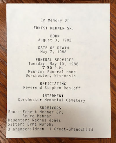 Mehner, Ernest Sr. (3 AUG 1902 - 7 MAY 1988)