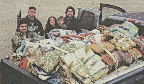Members of the Hands Foundation load a truck full of quilts and blankets to be