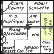 The map to the left represents section 15, Beaver Township, 1926. The property of Henry Bloom is highlighted in yellow. Obit: Bloom, Henry (1877 - 1940) *With additional photos Obit: Bloom, Lester R. (1923 - 2001) Obit: Schulze, Esther F. (1918 – 2005)