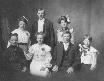 These are my great-grandparents, Edward and Ingebor Engebretson (sometimes spelled Engelbretson or Englebretson), with their five children in about 1905. My grandmother, Minnie, is between her parents in the front row. The order of appearance is: Back row: Elizabeth b.1886 (Krogness), Emil b.?, Anna 1889 (Johnstone) Front row: Ingebor, Minnie b.1892 (Bragstad), Edward, James b.1897