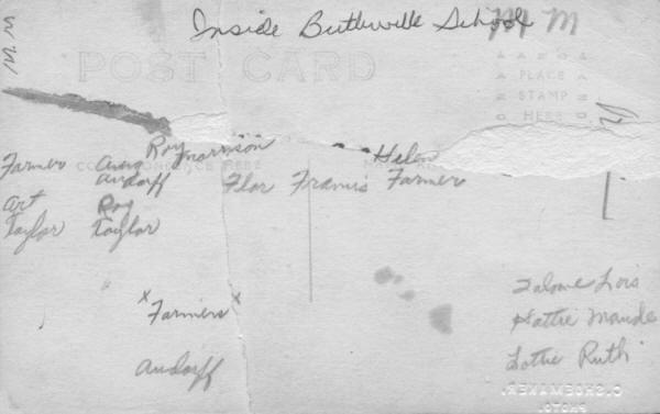 The back of this photo postcard had the names, Farmer, Anna Audorff, Roy Morrison, Flor Francis, Helen Farmer, Art Taylor, Roy Taylor, (x)Farmers(x) Audorff, Salome Lois, Hattie Maude & Lottie Ruth.