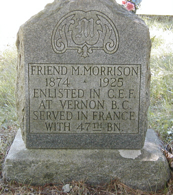 tn | Morrison, Mackman | B04N-03 | 17 Nov 1875 | 6 May 1925 | d. rcd 11-277; WWI-Canadian Army | Single | "Friend" & Caroline (Roscup) Morrison | |