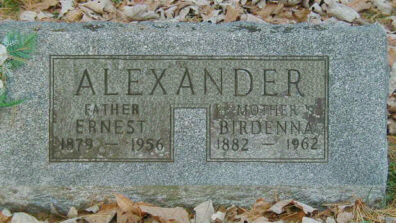 to | Alexander, Birdenna | 00-B060-5A | 24 Oct 1882 | 28 Nov 1962 | Ernest Alexander | 31 Dec 1901 | David & Laura (Baker) Ball | . |