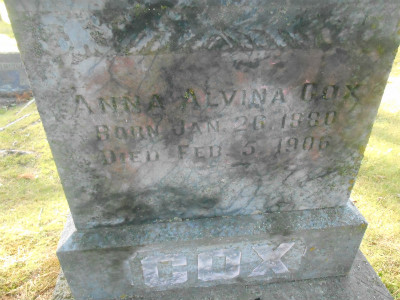 co | Cox, Infant boy | 02-D022- | Sep(?) 1903 | 6 Mar 1903 | Ernest & Laura (Cook) Cox | |||