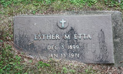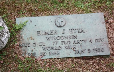 to | Etta, Elmer James | 02-G007-04 | 23 Apr 1888 | 5 Jan 1956 | Esther LeGault | 27 Aug 1920 | Jacob Henry & Anne (Stange) Etta | obit m. yr 8/27/1920/ d. Vet.s home in King, WI; WW I Vet - Musician |