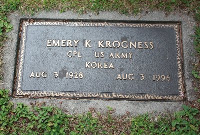 cso | Krogness, Emery Kenneth | 01-G009-04 | 3 Aug 1928 | 3 Aug 1996 | Olaf & Elizabeth (Engelbretsen) Krogness | Korean Vet - served four yrs | ||