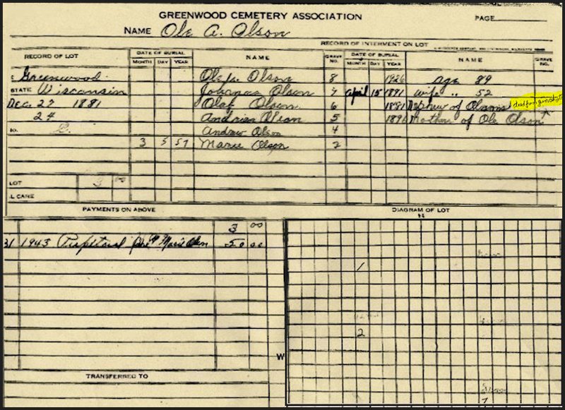 ty | Olson, Ole A. | 00-C024-08 | 14 Apr 1837 | 25 Jul 1926 | Johanna Johnson | 1867 | Andrea Olson ?? | b. Sheboygan Co. |