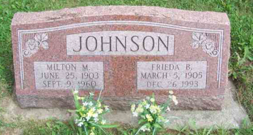 Johnson, Frieda Bertha | 5-Mar | 1905 | 26-Dec | 1993 | Milton Mahlon Johnson | 17-Apr | 1925 | William & Ella (Davidson) Sternitzky | |||