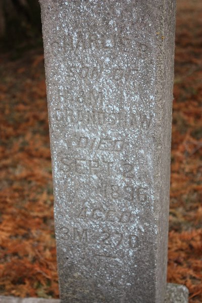 ct | Grandshaw, Charlie B.;images/GrandshawCharlie.JPG | 12/-/137 | 5 May | 1 Sep 1896 | Age 3 mo, 27 da | H. & M. Grandshaw | ||