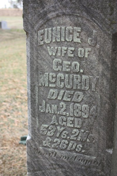 ct | McCurdy, Eunice J. | 33/-/267 | 6 Oct 1840 | 2 Jan 1894 | Age 53 yr, 2 mo, 26 da | George McCurdy | ||
