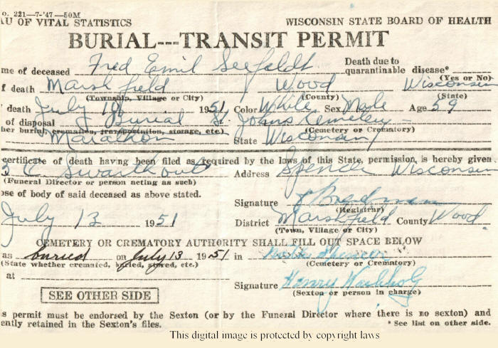 Seefeldt, Albert | 11 Jan 1873 | 12 Jul 1944 | b. Iron Ridge, Wis. |