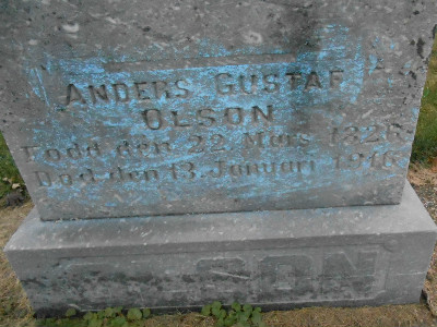 to | Olson, Anders Gustaf; #2 | 22 Mar 1826 | 13 Jan 1916 | b. Sweden |