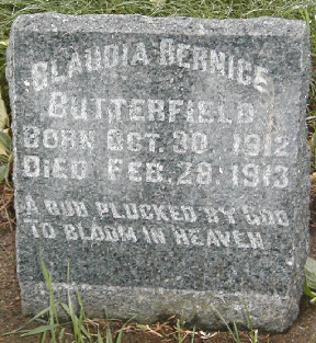 to | Butterfield, Claudia Bernice | 30-Oct-1912 | 28-Feb-1913 | b. Thorp, Clark, WI | Claud & Hattie (Wilson) Butterfield | ||
