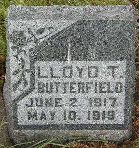 tof | Butterfield, Lloyd Thomas | 2-Jun-1917 | 10-May-1919 | b. Thorp, Clark, WI | Claud & Hattie (Wilson) Butterfield | ||