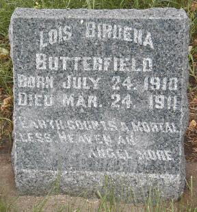 tf | Butterfield, Lois Berdina | 24-Jul-1910 | 24-Mar-1911 | b. Thorp, Clark, WI | Death Rcd 5-1002 | Claud & Hattie (Wilson) Butterfield |