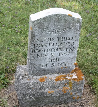xoy | Truax, Nettie | 16-Nov-1857 | 5-Feb-1931 | b. Orivell, Oswego Co., NY | Alonzo Truax | 18-Jun-1872 | |