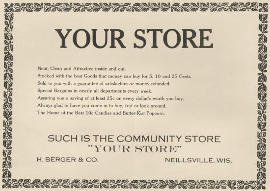 Neillsville has recently attracted considerable attention throughout the country because of the starting of a so-called community movement, a community secretary being employed to promote the general welfare of Neillsville and the surrounding country. Organizations of the business men, farmers, women and others are subsidiary to the central organization and efforts made to stimulate the development of the community along industrial, educational, agricultural and recreational lines.