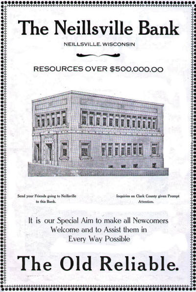The future of Neillsville is destined to be that of a prosperous, enterprising, steadily developing city in which values are bound to increase — not by any boom or by exploitation but by the growth in value of the surrounding country as the county develops, It is probable that water power will be utilized in the future and that the hum of industry In many mills and factories will supplement the prosperity of the farmer, dairyman and stock raiser. The eminent success of the canning factory and of the elevator and feed mill and of the co-operative creamery is a proof of the intelligence and enterprise of the citizens. The population of Neillsville is about 3000.