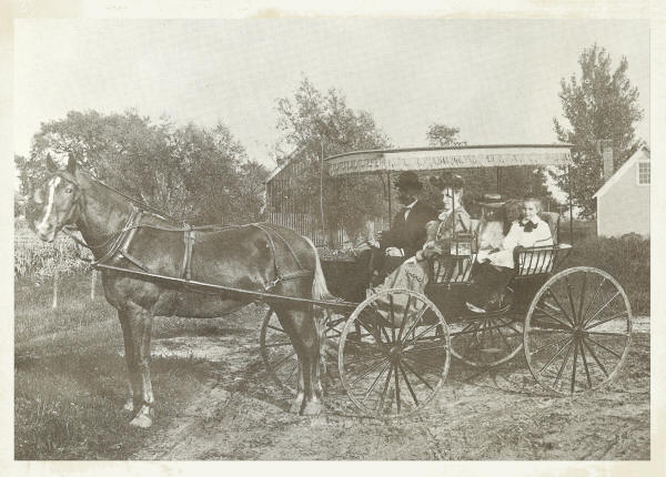 The surrey with the fringe on top was the modern transportation for the Hal B. J Andrus family. Seated with hi is his wife, Ethel Caldwell Andrus. In back from left to right are Flossie Leason Bennett, Dorothy Andrus Vanderhoeve and Vera Andrus. Mr. Andrus had one of the first butter factories in Clark County at the turn of the century.