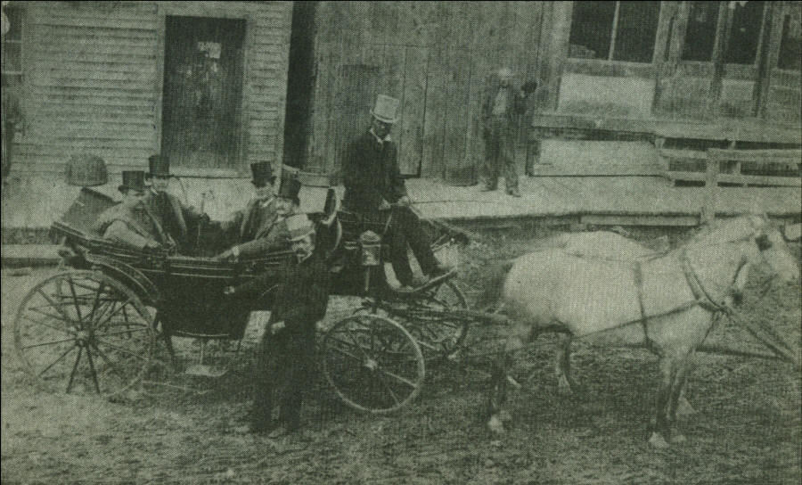 The pioneer lumbering Village of Neillsville had a boardwalk extending from the Hewett Wood store, corner of what is now, Fifth and Hewett Streets, west to the farm home of James Hewett. Old time elegance is displayed with the dapper attire including beaver top hats of the gentlemen, riding in a classy barouche pulled by a matched team of dapple grey horses. The men have refined attire and the classic barouche doesn’t seem to blend with the rough-lumber store fronts and boardwalk. The scene would have been circa 1870. (Photo courtesy of Elaine Free)