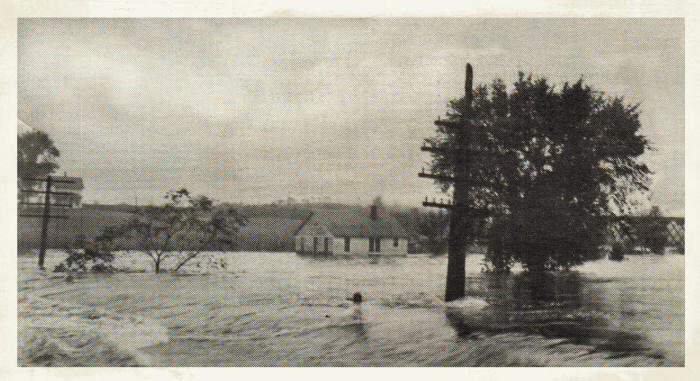 The above photo depicts the old Highway 10 route, which was flooded as it crossed the Black River on Neillsville’s west side, in the fall of 1938. The railroad trestle is visible in the distance. The telephone poles, half emerged in the river’s overflow, is evidence of the magnitude of the flood.