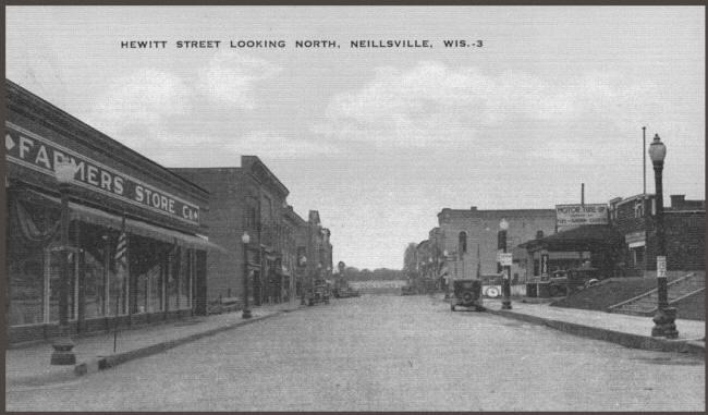 A 1931 view of Neillsvilles business section on Hewett Street looking north from the Fourth Street intersection, when the Farmer Store was on the northwest corner (Photo courtesy of Bill Roberts collection) |