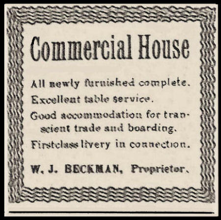 W. J. Beckman, who has been running the Commercial House during the past year, has bought out a restaurant and confectionery business in Augusta and will move his family up there shortly. 18 Oct 1901.